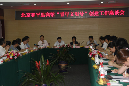 揭牌仪式结束后,出席的领导同志与大家就和平里宾馆全国“青年文明号”创建工作进行了亲切座谈。