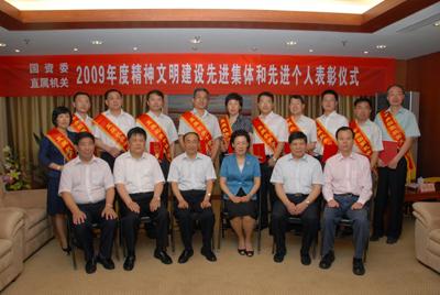 6月3日,国资委直属机关精神文明建设领导小组在西便门办公区205会议室举行表彰仪式,对委直属机关荣获2009年度 “中央国家机关文明单位标兵”称号的单位和“国资委直属机关十佳文明之星”称号的个人进行表彰。国资委党委委员、副主任、直属机关党委书记、直属机关精神文明建设领导小组组长黄丹华同志,国资委党委委员、管理局党委书记、直属机关精神文明建设领导小组副组长李寿生同志出席表彰仪式并为获奖单位和个人代表颁奖。机械工业信息研究院等3个单位被评为“中央国家机关文明单位标兵”,中国经济出版社等40个单位被评为“中央国家机关文明单位”,直属机关党委李峰同志被评为“中央国家机关精神文明建设先进工作者”,机关离退休干部局等9个单位被评为“国资委直属机关文明单位”,办公厅委主任书记办等11个处室被评为“国资委机关文明处室”,办公厅刘洪飞等10位同志被评为“国资委直属机关十佳文明之星”。