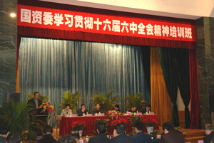 为进一步深入学习贯彻十六届六中全会精神和《江泽民文选》,从2006年12月18日至2007年1月11日,国资委分三期举办了党员领导干部学习贯彻十六届六中全会精神培训班。培训班的主题是:深入学习贯彻十六届六中全会精神,结合学习《江泽民文选》和中央经济工作会议精神,提高党员领导干部对构建社会主义和谐社会的认识,结合实际,深入探讨国有企业特别是中央企业在构建社会主义和谐社会中的定位、作用和措施,进一步统一思想,理清思路,明确明年的工作重点,开创未来三年工作新局面。