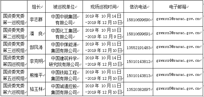 根据党中央关于巡视工作的决策部署,按照国资委党委工作安排,10月中旬,国资委党委巡视组进驻中国诚通控股集团有限公司、中国中煤能源集团有限公司、中国中钢集团有限公司、中国化工集团有限公司、中国建筑科学研究院有限公司、中国铁路工程集团有限公司等6家中央企业开展常规巡视。