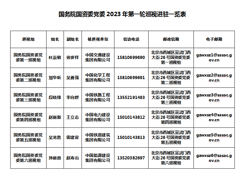 按照国务院国资委党委和巡视工作领导小组部署安排,7月17日至19日,国资委党委6个巡视组分别进驻中国交通建设集团有限公司、中国化学工程集团有限公司、中国铁路工程集团有限公司、中国电力建设集团有限公司、中国铁道建筑集团有限公司、中国能源建设集团有限公司等6家委管中央企业党委开展常规巡视。各巡视组分别召开巡视进驻动员会,各巡视组组长作动员讲话,被巡视企业党委主要负责人作表态发言。