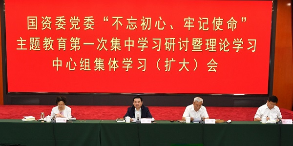 6月17日至18日,国资委党委召开“不忘初心、牢记使命”主题教育第一次集中学习研讨暨理论学习中心组集体学习(扩大)会,国资委党委书记、主任郝鹏主持学习研讨并讲话,强调要深入学习贯彻习近平新时代中国特色社会主义思想,进一步树牢“四个意识”、增强“四个自信”、坚决做到“两个维护”,紧密结合国资国企改革发展和党的建设实际,高标准高质量开展“不忘初心、牢记使命”主题教育,推动国资国企各项工作再上新台阶。中央第二十一指导组组长林军及有关成员到会指导。中央党史和文献研究院院长曲青山作了专题辅导报告。国资委党委委员、副部长级干部参加学习研讨。