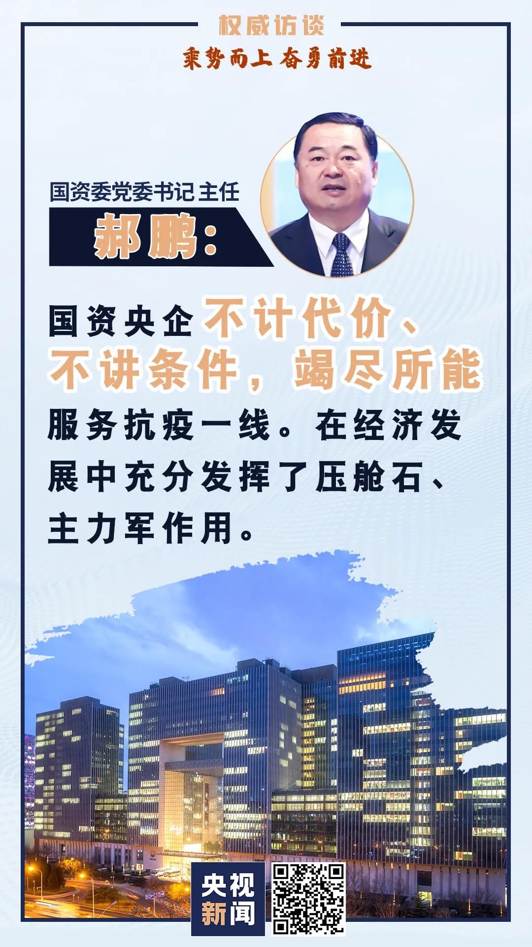 国资委党委书记 主任 郝鹏:我们将采取一系列措施,突出抓好五个方面重点工作:抓好提质增效稳增长,抓好企业改革落实落地,抓好关键核心技术攻关,抓好国有资本布局优化和结构调整,抓好重大风险防范化解。