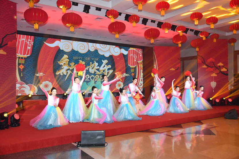 团拜会上欢声笑语回荡,干部职工自编自演的舞蹈、歌曲、情景剧、国风展示等节目精彩纷呈,充分展现了广大干部职工为国资央企事业拼搏奉献的精神风貌,赢得了阵阵热烈掌声,会场充满了欢乐、祥和、喜庆的节日气氛。最后,大家齐声高唱《中国 中国 鲜红的太阳永不落》,将气氛推向高潮。