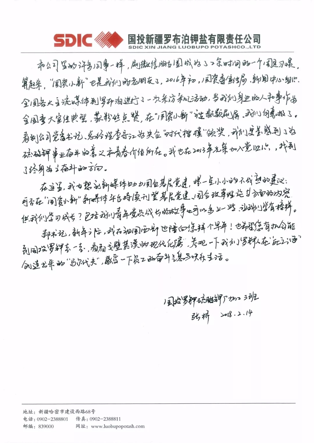 这封写给郝鹏书记的信,来自国投新疆罗布泊钾盐有限责任公司硫酸钾厂加工车间加工三班的一位普通青年员工。