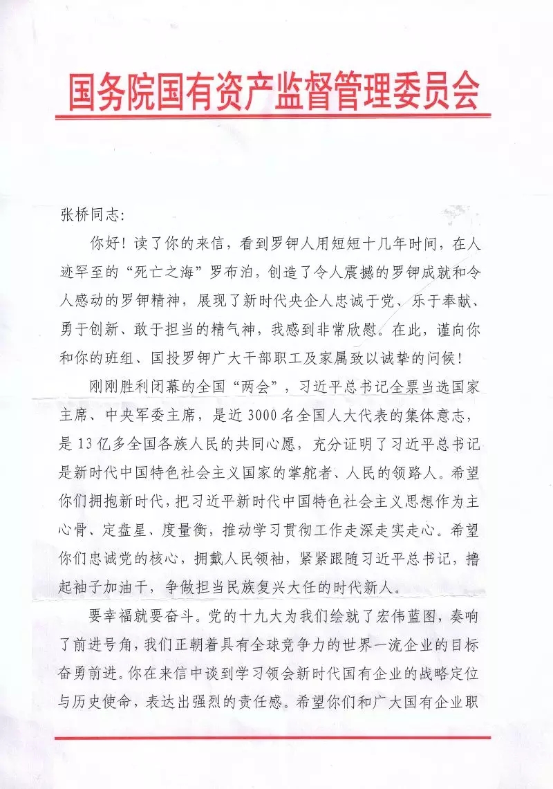 我是国投新疆罗布泊钾盐有限责任公司的一名普通的85后员工。前几天,通过“国资小新”微信看到了您在接受《求是》杂志专访的《新时代国有企业的战略定位与历史使命》文章,受益匪浅。您的思考,通篇贯彻着习近平新时代中国特色社会主义思想,为我们讲述了新时代国有企业的战略定位、历史使命和改革发展的新目标新举措,不仅解开了我们基层员工的一些思想困惑,也指明了我们国企未来的发展方向。所以,就想通过写信的方式和您交流一下学习心得。