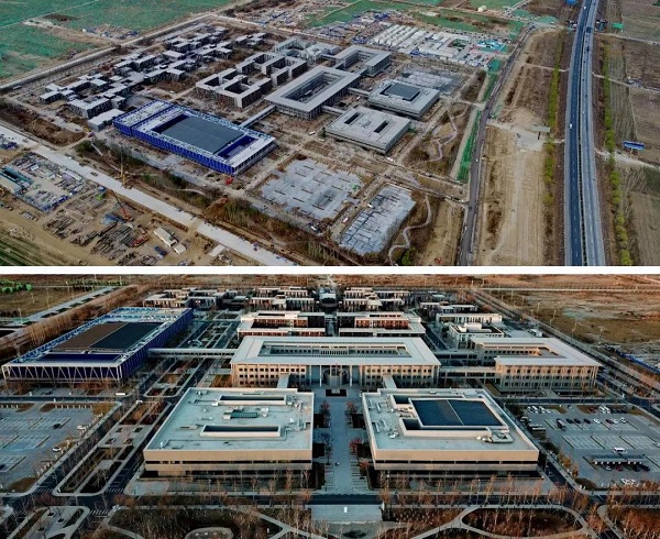拼版照片:上图为2018年3月29日拍摄的正在建设中的雄安市民服务中心;下图为2018年12月7日拍摄的竣工并已投入使用的雄安市民服务中心。