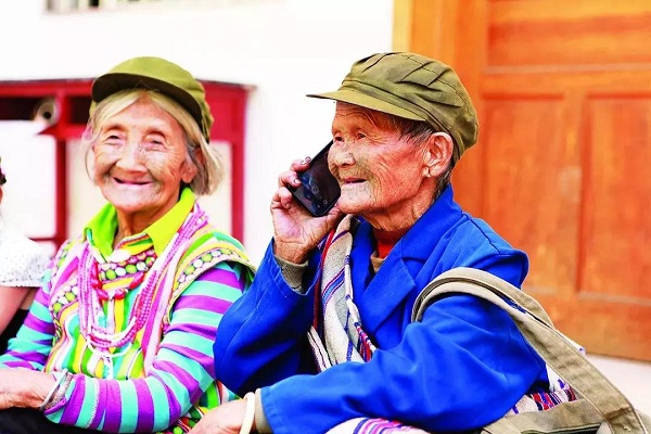 独龙族纹面女试用天翼智能手机