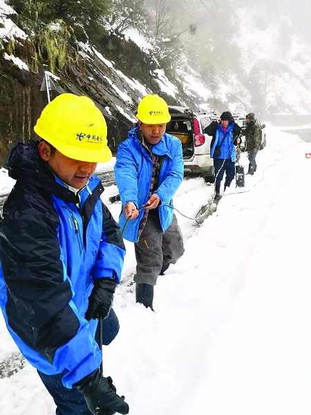 中国电信员工在大雪封山的季节,将光缆拉进独龙江
