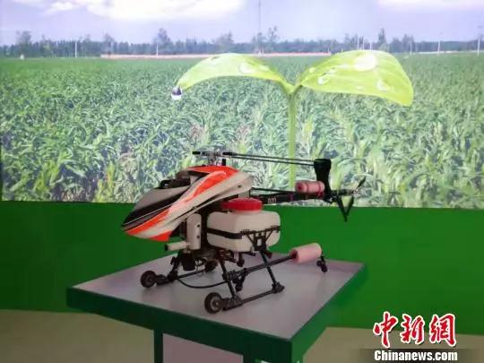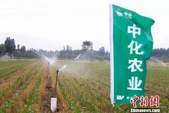 在位于滨州市阳信县河流镇张古风村的中化现代农业阳信技术服务中心的示范农场,立杆摇臂式自动喷洒设备正在对农田进行喷洒式施肥。3辆大型自走式打药机和6架小型植保无人机,在工作人员的操控下,对该示范农场的100亩玉米苗进行机械化作业。