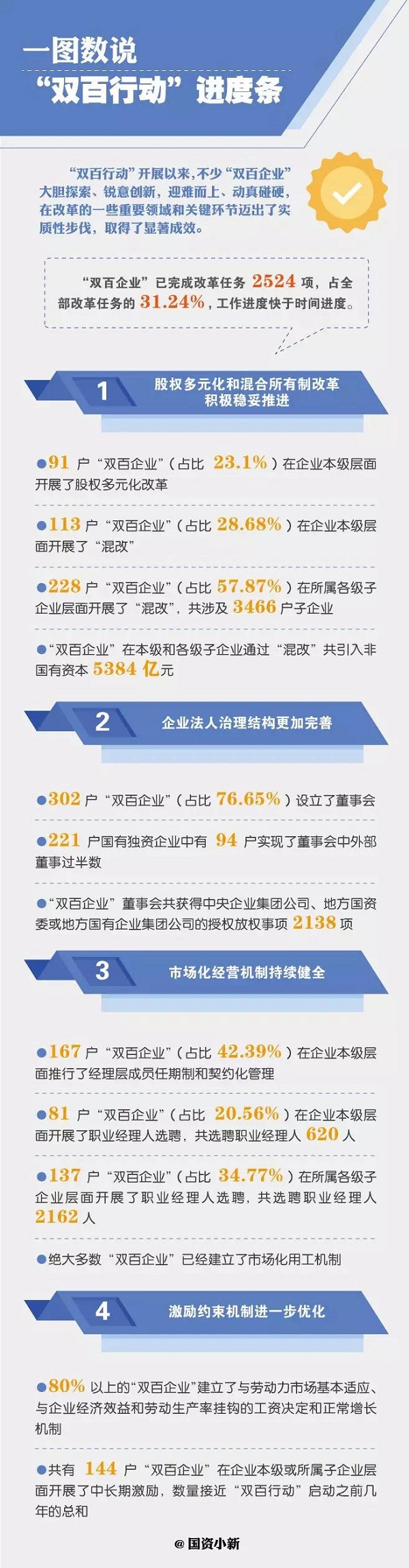自去年8月正式启动以来,“双百行动”相关顶层设计和改革实施不断向前推进。目前,共有444户央企子企业和地方国有骨干企业入围“双百企业”名单,“双百企业”已累计完成全部改革任务的30%以上,工作进度快于时间进度,并在不少重要领域迈出实质性步伐。