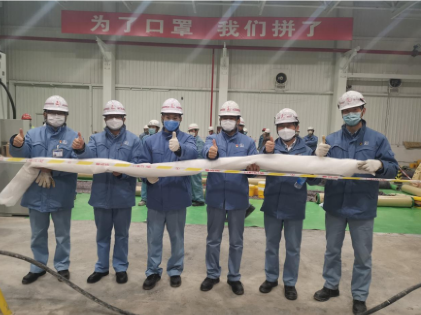 在疫情面前,中石化提出“学习火神山,半月建座厂”的口号。”自2月24日正式破土动工以来,中石化燕山熔喷布项目参建各方400多名工人24小时不间断,昼夜接力奋战。3月5日8时30分,完成大型关键设备的安装工作,开始进行风机试运转,3月6日深夜,口罩核心原料熔喷布生产线提前48小时投料试产。23时许开始进行试生产,23时59分56秒,燕山石化熔喷布生产线一卷供应市场的商用熔喷布下线。