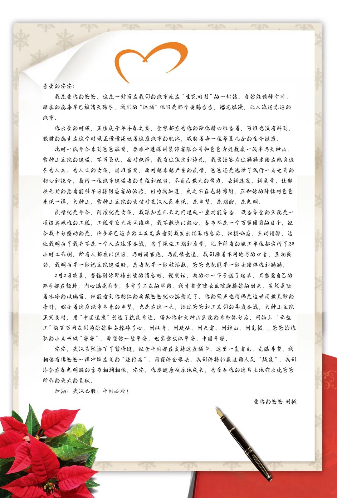 谈到以后将如何向儿子描述这段“战役”,刘铖表示:“在他即将出生的时候,我正在从雷神山赶往火神山的路上。当时为他写了一段话,想告诉他,由于这次新冠肺炎疫情很严重,全中国的人都被隔离在家,即使如此,仍然有很多人选择了‘逆行’,爸爸也是其中一名。为了建成这两座医院,大家付出了太多太多,亲身感受到‘中国速度’,这就是一个奇迹。‘两山’医院就是重症患者的诺亚方舟,给了他们生的希望。”
