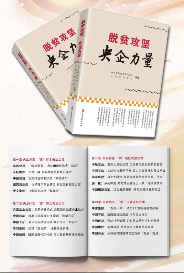 为贯彻落实习近平总书记关于“脱贫攻坚不仅要做得好,而且要讲得好”的重要讲话精神,国务院国资委新闻中心和人民政协报社联合编著《脱贫攻坚 央企力量》一书,于近日由文史出版社出版。这是以宣传央企扶贫经验、树立央企担当形象、打造央企扶贫品牌为目标的纪实性系列图书之一,是继2018年共同编著《精准扶贫 央企在行动》后的又一力作。
