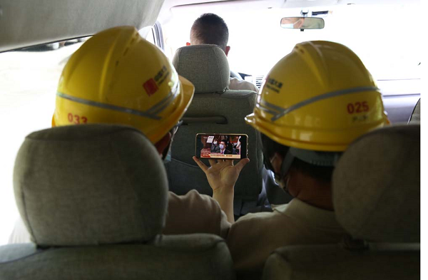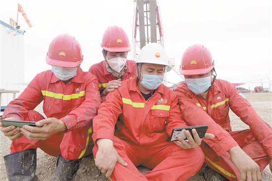 中国石油西部钻探准东钻井公司90008钻井队员工用手机在工作现场收看十三届全国人大三次会议开幕会直播。