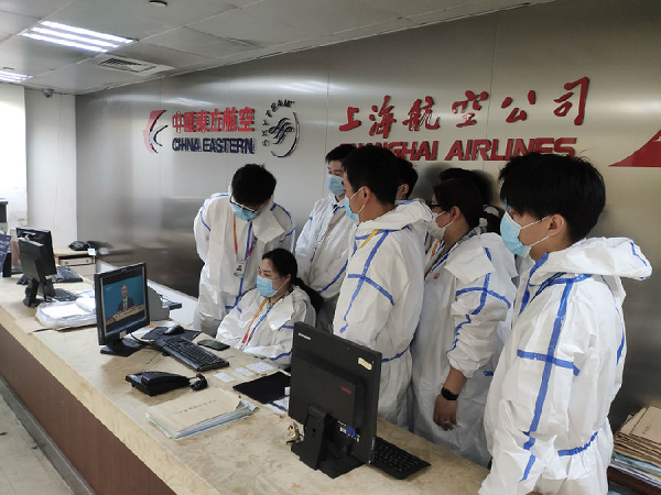 中国东航地面服务人员因为严防输入性疫情的需要,身穿防护服奋战在岗位上,利用工作间隙集中观看两会直播。