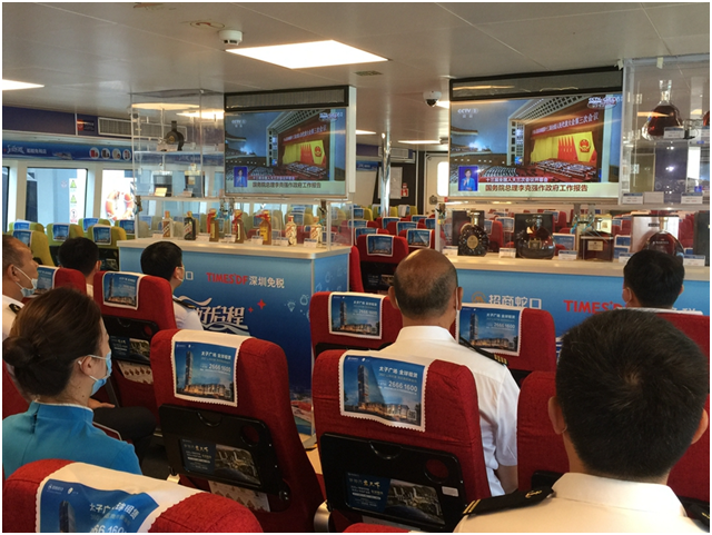 招商蛇口邮轮事业部工作人员在船上集体收看十三届全国人大三次会议开幕会直播。