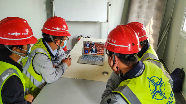 中交集团天津地铁11号线一期工程PPP项目施工工人在宿舍通过网络电视观看十三届全国人大三次会议开幕会直播。