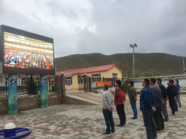 在内蒙古赤峰,来自中国能建西北电建的赤峰大虎台风电吊装10万千瓦清洁供暖风电项目部职工,在当地村委会门口通过大屏幕观看十三届全国人大三次会议开幕会直播。