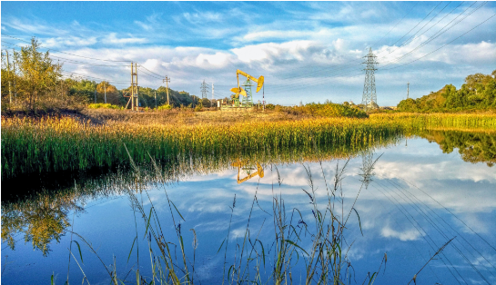 中国石油大庆油田被一片绿意包围的抽油机