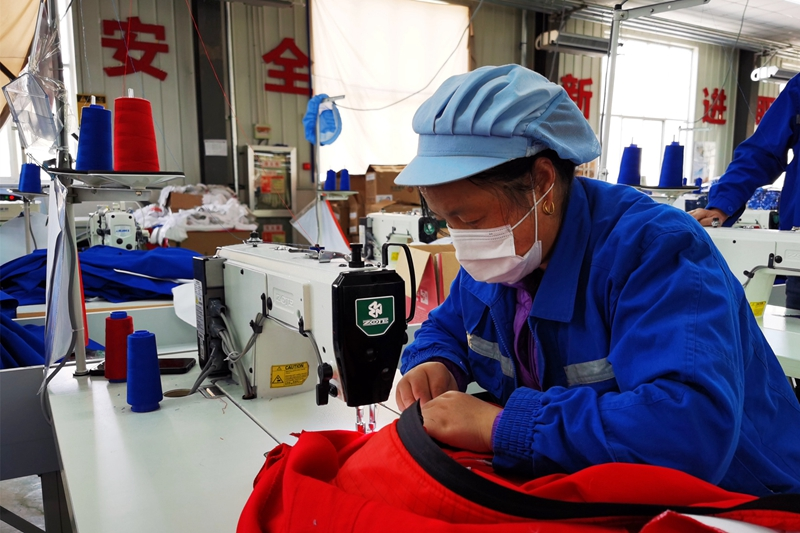 中国海油建立的扶贫车间里的工人正在缝制工服