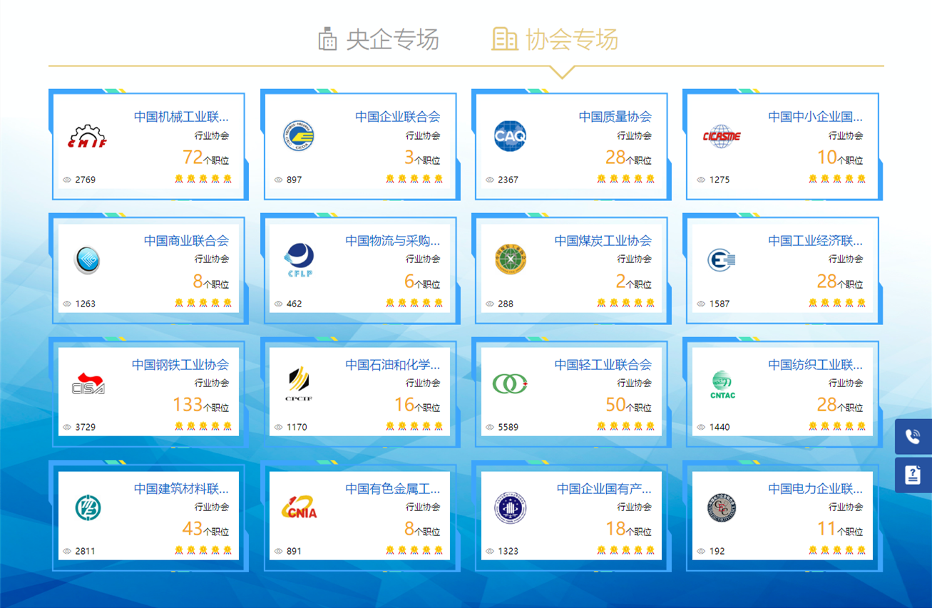 多个行业协会不仅自身提供就业岗位,还充分发挥“中字头”协会影响力大、联系的企业覆盖面广的优势,积极带动行业企业参与网络招聘专项活动。钢铁协会闻令而动,率先组织行业内院校、地方国有企业、民营企业参加专项网络招聘活动;商业联合会分批推进,对用人需求较多会员单位重点关注,吸引了沃尔玛中国总部及四大区和山姆会员店发布900多个人才需求;电力联合会动员会员单位及其分公司、分支机构,共同参与并发布招聘计划;煤炭协会组织7家会员单位持续发力,累计提供了800多个岗位和2300多个人才需求等等。