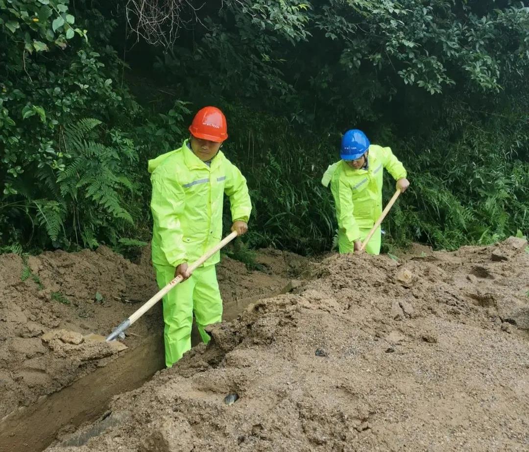 位于湖南的中广核邱家仑风电场区域地形多为丘陵,呈东高西低走势,局部暴雨极易形成地表洪流,面临着严峻的防洪防汛形势。受暴雨影响,风场部分进场主线道路山体滑坡,导致道路被山土覆盖及排水沟堵塞,严重影响车辆正常通行和防洪沟排水。场站值班人员立刻成立应急小组赶赴塌方现场,清理滑落在道路上的山土、石块,以及对排水沟进行疏通,消除安全隐患。