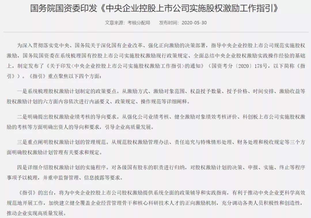 2020年5月30日,国务院国资委制定发布了《关于印发<中央企业控股上市公司实施股权激励工作指引>的通知》(国资考分〔2020〕178号,以下简称《指引》)。《指引》重点聚焦以下四个方面:一是系统梳理股权激励计划定的政策要点。二是明确提出股权激励业绩考核的导向要求。三是重点阐明股权激励计划的管理规范。四是详细介绍股权激励计划的实施程序。《指引》的出台,将为中央企业控股上市公司股权激励提供系统全面的政策辅导和实践指南。