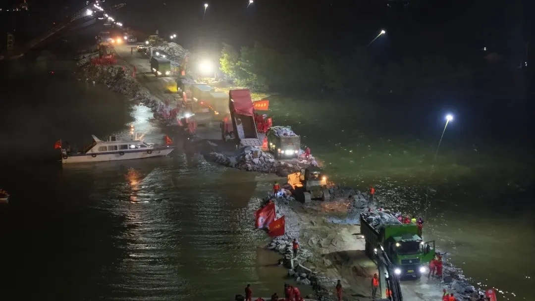 中国建材所属湖南汨罗南方新材料、湖南临澧南方新材料、湖南桃源南方新材料连夜调度,对矿区内储备块石进行统筹发运。4天内,22403吨块石源源不断运抵决口封堵现场。