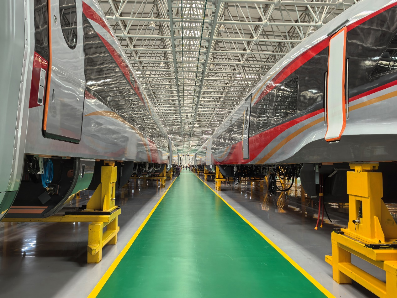 高铁生产按照工艺布局分为“车体、涂装、装配、调试”四个主要单元,大家熟知的“和谐号”“复兴号”都是在这里装配完成,奔驰在祖国大地。这条装配产线具备月产14列动车组的生产能力。