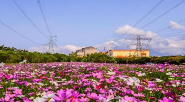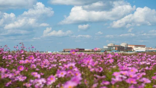 每年夏季,红沿河核电基地内的波斯菊、薰衣草盛开,形成一片面积超10万平方米的格桑花海。