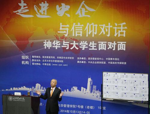 10月13日下午,中国神华集团总经理凌文走上北京大学光华管理学院阶梯教室讲台,进行了一场主题为《从世界角度看中国国有企业》的演讲,与200余名各高校学子展开了坦诚、开放的面对面互动交流,由此拉开“走进央企•与信仰对话”——央企高管与大学生面对面系列活动的序幕。