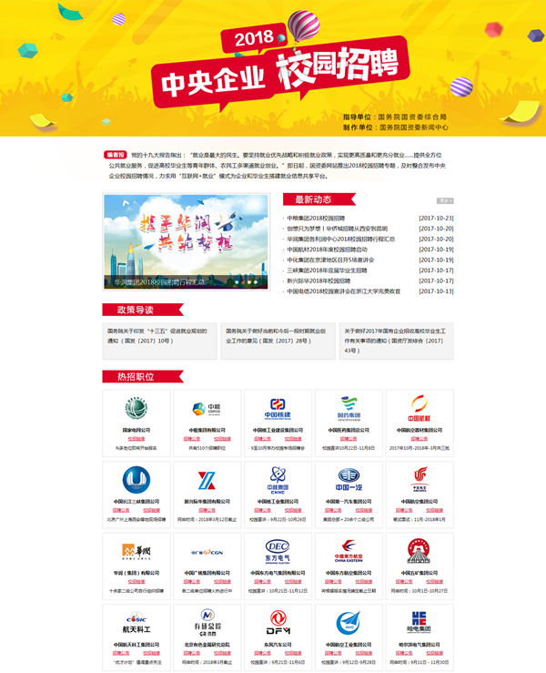 10月23日,国务院国资委网站重磅推出“2018中央企业校园招聘专栏”。截至目前,初步整合了中国移动、中航集团、中化集团、中国商飞、中国中车、中交集团等30余家中央企业的20000多个热招职位,用“互联网+就业”模式为企业和毕业生搭建起就业信息共享平台。