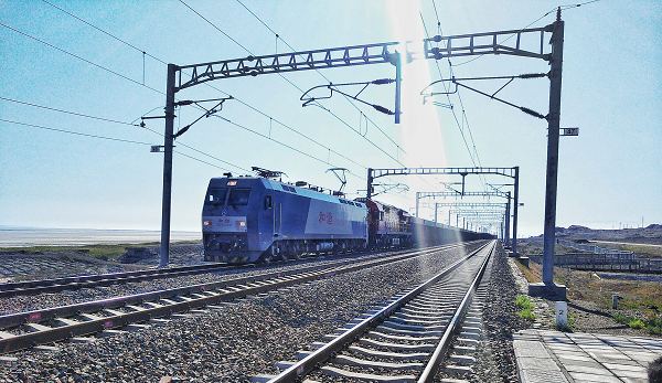 图为开往哈萨克斯坦的电气化线路火车。(国资委新闻中心 雷玉川摄)