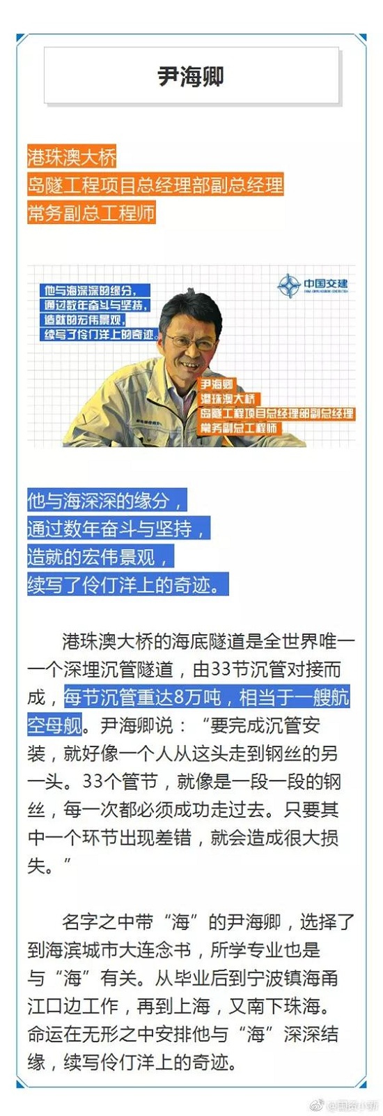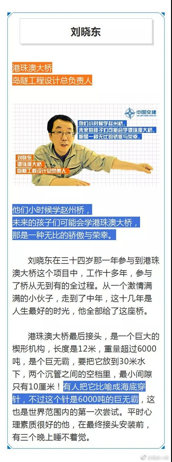 从2003年可行性研究开始,中国央企为之奋斗了15年。2009年12月工程动工,数万名建设者在伶仃洋外海已苦战9年,多少荆棘风雨,多少酸甜苦辣,此刻化为笑颜永远定格在中国的历史。今天,让我们在感叹超级工程的震撼之时,请把C位留给这些大桥建设者们。
