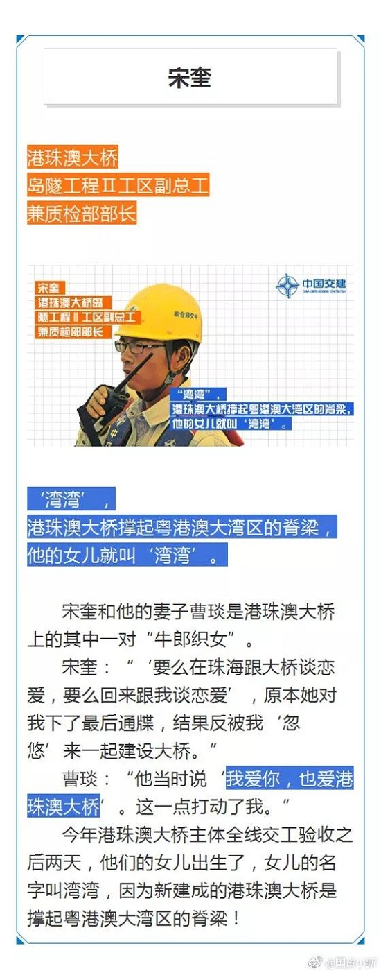 2012年,宋奎毕业刚出校门便踏上了刚刚成型的港珠澳大桥东人工岛,但高难度、高强度工作都压不垮的宋奎却被和恋人曹琰两地分居这道难题困扰着。曹琰从长沙到珠海看自己,他安顿好女友后又坐船到了海上的工地。曹琰脚部被砸伤住院3个月,但直到出院,宋奎都没能回去看她,曹琰甚至给他下了最后的通牒 “要么在珠海跟大桥恋爱,要么回长沙跟我恋爱。” 但2015年初曹琰也来到岛隧项目部,夫妻共同成为大桥的建设者。2018年,他们的孩子出生了,“湾湾”是孩子的名字,以此来纪念为港珠澳大桥建设奋斗的青春。