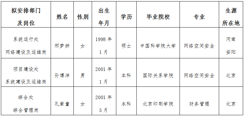 根据事业单位公开招聘人员有关规定,国资委信息中心先后完成公开报名、资格审核、考试、体检、考察等程序,经研究,拟聘用以下2023年应届高校毕业生为我中心工作人员,现予公示。