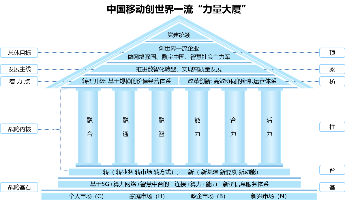 近年来,新一轮科技革命和产业变革深入发展,5G等新一代信息技术加速融入经济社会民生,引发“比特×瓦特”深度融合聚变,加速各领域数字化、网络化、智能化进程,不断催生新的经济形态。人类社会已经进入到以信息为主导、信息和能量深度融合发展的信息文明时代,信息对人类文明演进驱动作用更加凸显,数字经济大有可为、信息服务大有可为、信息技术融合创新大有可为。中国移动坚持站在党和国家事业发展全局高度,立足“两个大局”,牢记“国之大者”,把公司发展放在历史长河和时代大潮中去思考、去谋划,精准发力“两个推进、两个融合”(全面推进新型信息基础设施建设、全面推进全社会数智化转型,加速信息技术融合创新、加速信息技术与经济社会民生深度融合),坚定不移做强做优做大国有企业,奋勇当先做强做优做大数字经济,更好发挥信息在人类文明演进中的重要驱动作用。强化战略引领,研究明确了世界一流信息服务科技创新公司发展定位,制定实施了创世界一流“力量大厦”发展战略,即:以习近平新时代中国特色社会主义思想为指导,坚持和加强党的全面领导,坚持稳中求进,坚持创新驱动,以“创世界一流企业,做网络强国、数字中国、智慧社会主力军”为总体目标,以“推进数字化转型、实现高质量发展”为主线,围绕转型升级、改革创新着力点,加快“三转”、聚力“三新”、深化“三融”、提升“三力”,系统打造以5G、算力网络、智慧中台等为重点的新型信息基础设施,创新构建“连接+算力+能力”新型信息服务体系,统筹推进CHBN(个人、家庭、政企、新兴市场)全向发力、融合发展,推动信息服务融入百业、服务大众。