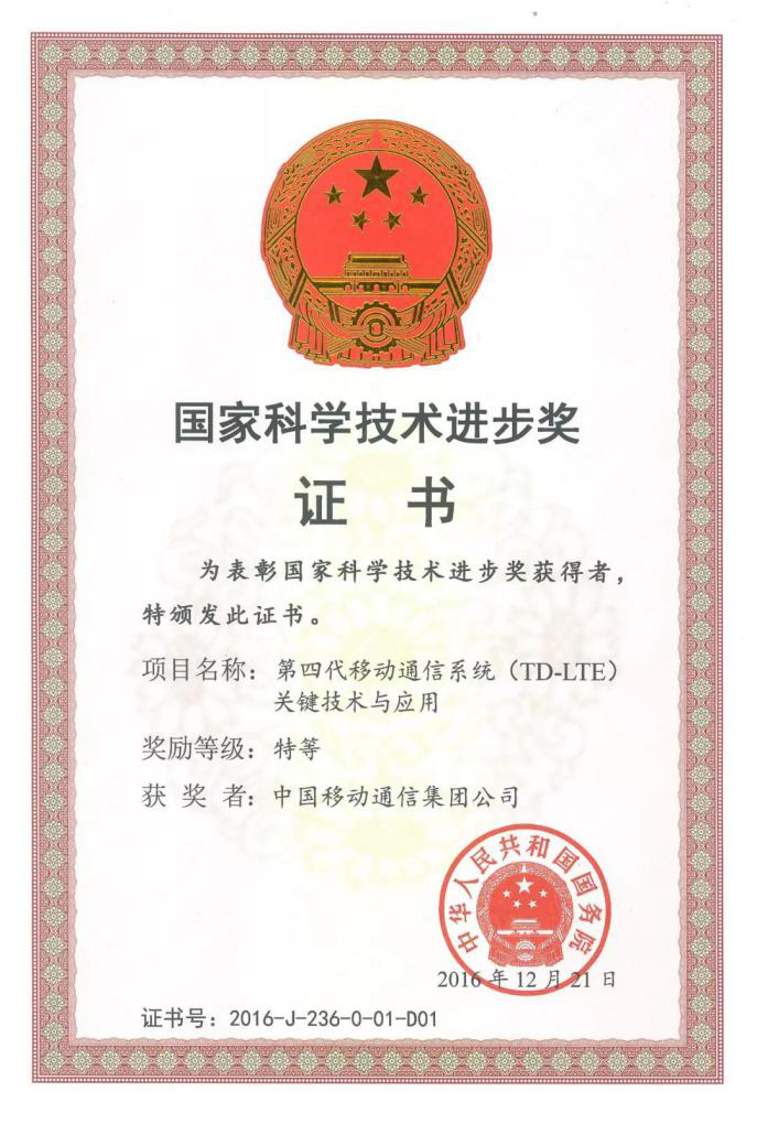 中国移动坚决贯彻落实习近平总书记提出的“抓紧突破网络发展的前沿技术和具有国际竞争力的关键核心技术”等重要指示精神,坚持创新在公司发展全局中的核心地位,勇挑重担、勇攀高峰,努力走在信息通信技术发展最前沿。3G时代,独家建设运营我国自主知识产权TD-SCDMA网络,从零起步支持TD-SCDMA产业化,牵头的“TD-SCDMA关键工程技术研究及产业化应用”获国家科学技术进步奖一等奖。发展3G客户2.4亿户,全面实现中国标准与美国CDMA2000、欧洲WCDMA“三分天下有其一”的发展目标。4G时代,推动我国主导的TD-LTE技术被确立为两大4G国际标准之一,依托牵头发起的国际合作平台GTI(TD-LTE全球发展倡议),带动86个国家部署184张TD-LTE商用网络,首次实现中国主导技术、全球规模应用,牵头的“TD-LTE关键技术与应用项目”获国家科学技术进步奖特等奖。