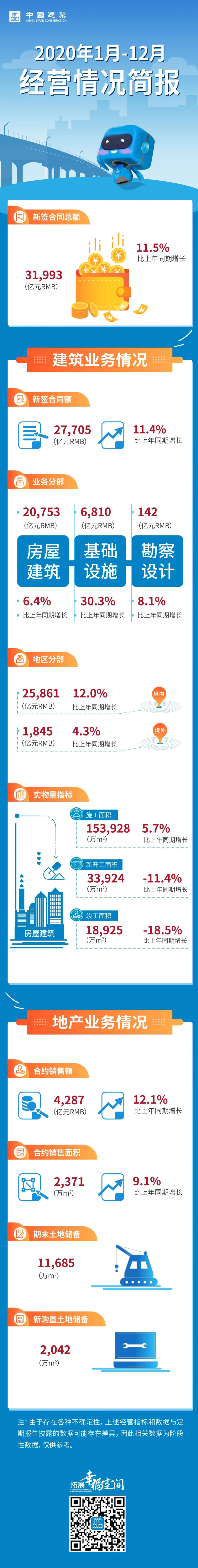 2021年1月7日,中国建筑(601668.SH)公布2020年1-12月经营情况简报。全年,公司克服疫情不利影响,累计完成新签合同额31,993亿元,再次刷新全球建筑企业订单记录,圆满完成全年目标,整体订单表现强劲,同比增长11.5%。
