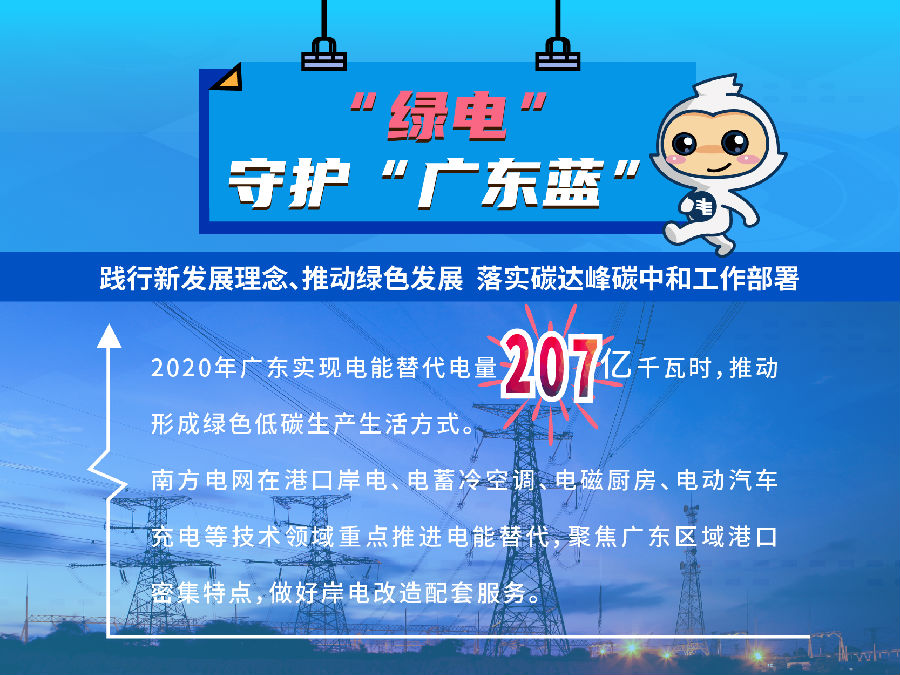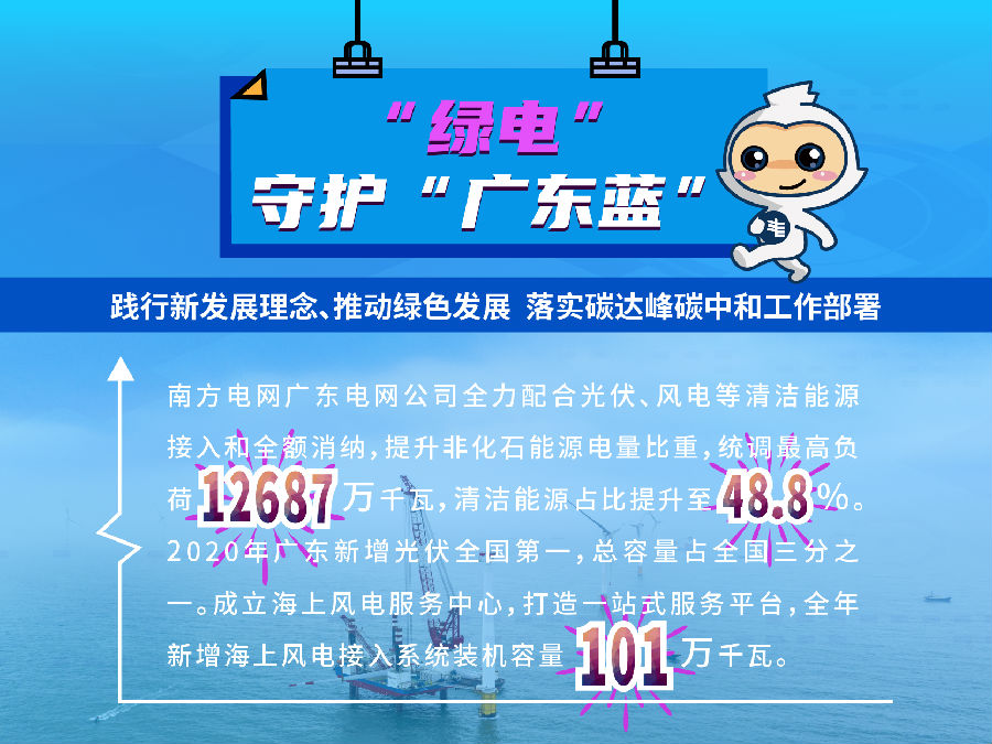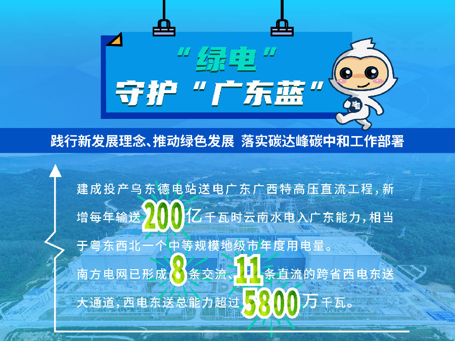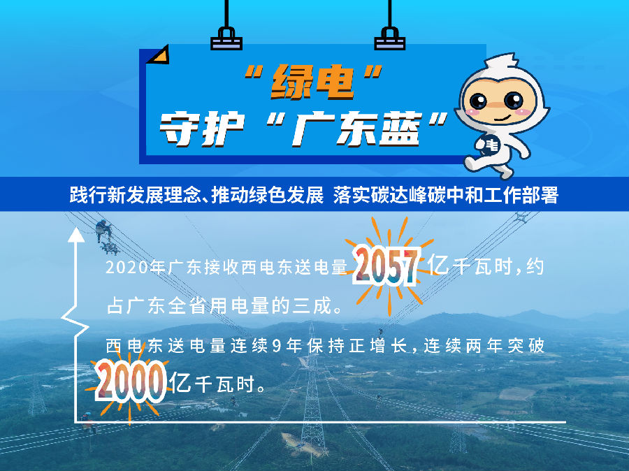 2020年广东空气质量持续改善,主要污染物连续六年达标。南方电网公司通过建设坚强电网、加大西电清洁能源输送、引导社会科学用电等措施,让绿色清洁能源有力支援实现“广东蓝”。2020年,广东接收西电连续9年维持正增长,建成乌东德送电广东特高压柔性直流示范工程,推进电能替代,加快风电、光伏等清洁能源接入,在最高负荷12687万千瓦、全年用电量持续增长的情况,以绿色电力守护广东碧水蓝天。一组图带你认识“绿电”如何守护“广东蓝”。