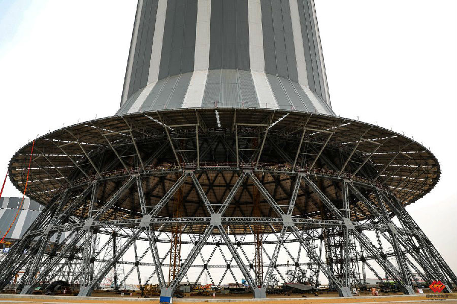2021年1月9日,1号冷却塔的“裙摆”——展宽平台吊装完成。这标志着该冷却塔已具备吊装散热器的条件。