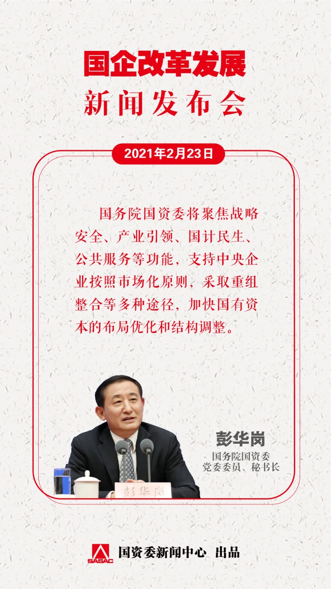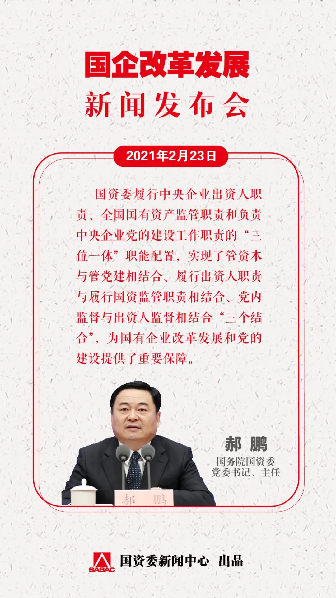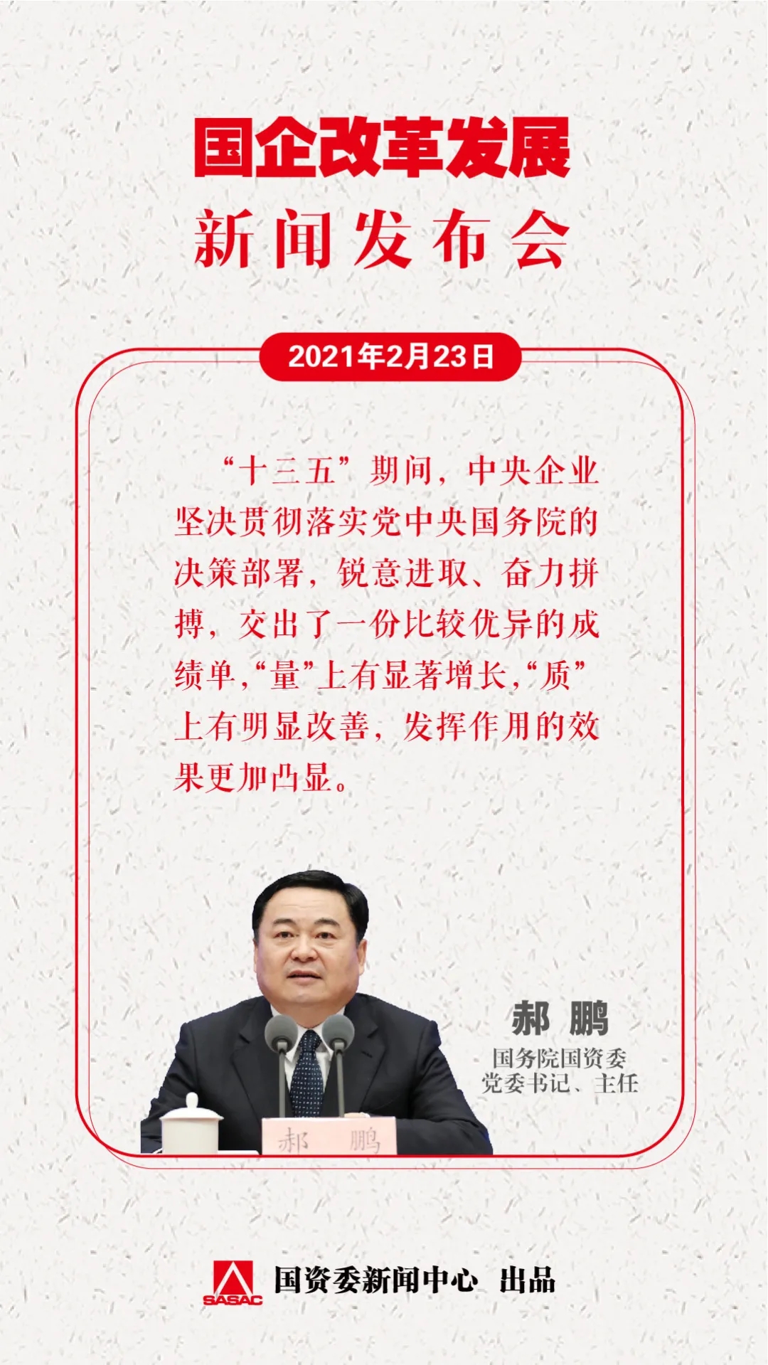 2月23日,国务院国资委党委书记、主任郝鹏应邀出席国务院新闻办举行的新闻发布会,介绍国资国企发展改革监管和党的建设工作情况,并就如何深化国企改革、加大科技创新、完善国资监管体制、参与共建“一带一路”、推进重组整合、防范化解金融风险等,回答了中外媒体记者提问。国务院国资委秘书长、新闻发言人彭华岗参加新闻发布会,并回答了有关问题。