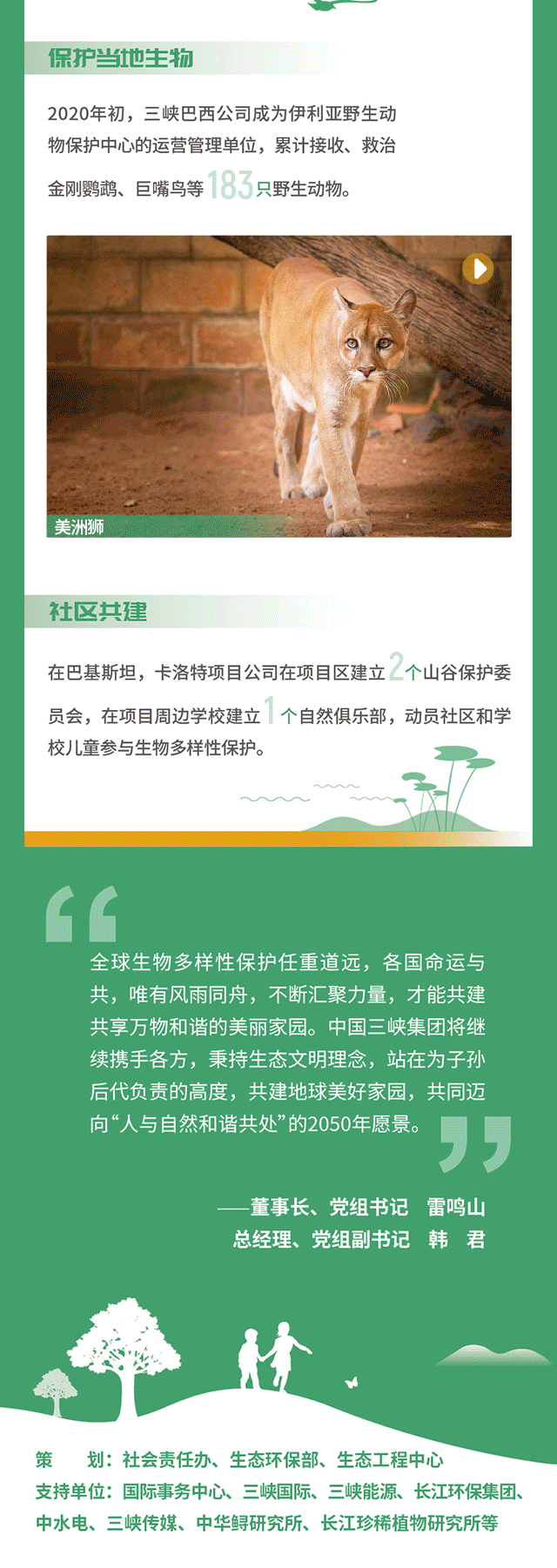 5月22日,在第29个国际生物多样性日和联合国《生物多样性公约》缔约方大会第十五次会议(COP15)第二阶段会议召开之际,中国三峡集团正式对外发布首份生物多样性保护报告(中英双语版),全面披露中国三峡集团多年来在生物多样性保护方面的理念、管理、行动和成效,以此宣示中国三峡集团坚定不移为生物多样性保护贡献智慧和力量的决心。