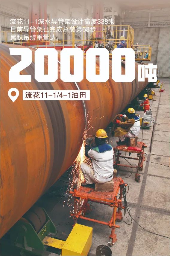 塔机高耸,导管蜿蜒,流花11-1/4-1油田二次开发项目深水导管架和圆筒型FPSO(浮式生产储卸油装置)在珠海和青岛南北呼应,建造场地热火朝天。其中,导管架已完成总装第63步,累计吊装重量达20000吨,圆筒型FPSO完成船体“双层底”合龙,船体建造进入全面加速期。