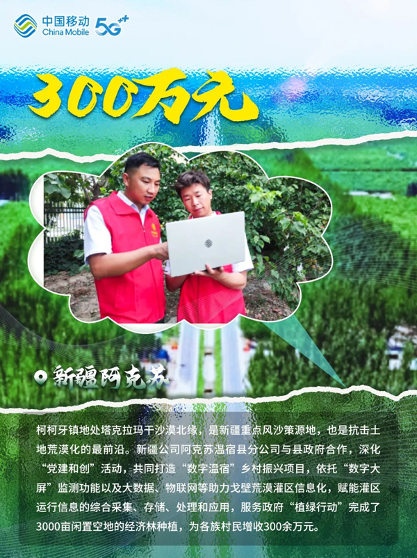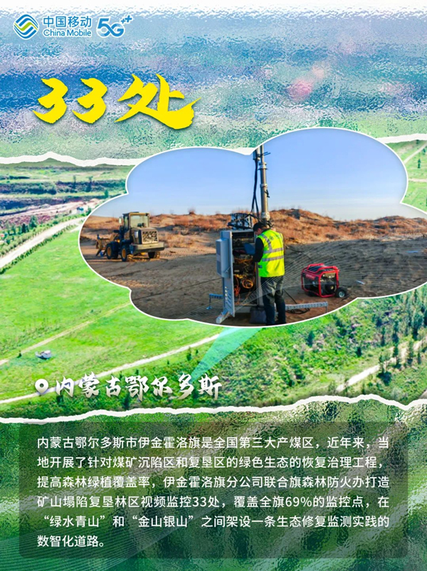绿水逶迤去,青山相向开。多年来,从“三北”防护林体系建设到京津风沙源治理,从“退耕还林”到“复垦归田”,从“大漠风尘日色昏”到“黄沙止步绿意浓”,中国创造了一系列防沙治沙新奇迹。在这场“绿进沙退”的伟大斗争中,中国移动贯彻落实“绿水青山就是金山银山”的发展理念,在以数智技术助力防沙治沙和生态保护中展现新作为。
