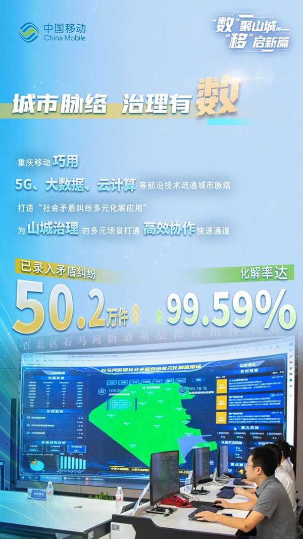 部署5.3万个5G基站、打造5G+典型应用场景超100个、录入矛盾纠纷50.2万件……近年来,中国移动重庆公司以全方位的战略布局和高效执行机制,推动着数字信息的高效流通、数字产业的蓬勃发展以及数字服务的精准供给,促进数字重庆建设在智能化、高效化轨道上稳健前行。