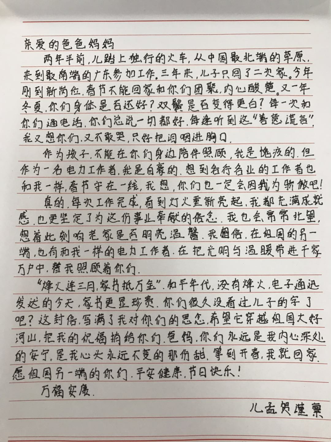 “烽火连三月,家书抵万金。”和平时代,没有烽火,电子通讯发达的今天,家书更显珍贵。你们很久没看过儿子的字了吧?这封信,写满了我对你们的思念,希望它穿越祖国大好河山,把我的祝福捎给你们。爸妈,你们永远是我内心深处的安宁,是我心头永远不变的那份甜,等到开春,我就回家。愿祖国另一端的你们,平安健康,节日快乐!