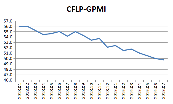 全球制造业PMI自今年4月以来,呈现持续下行走势,本月降至荣枯线以下,意味着全球经济下行态势明显。各国家和区域之间的贸易摩擦频发,扰乱全球产业链的运行秩序,严重影响了全球经济增长的可持续性。国际货币基金组织(IMF)7月23日发布的《世界经济展望》报告预测,全球经济2019年将增长3.2%,2020年将回升至3.5%,增速预测较4月份均下调了0.1个百分点。