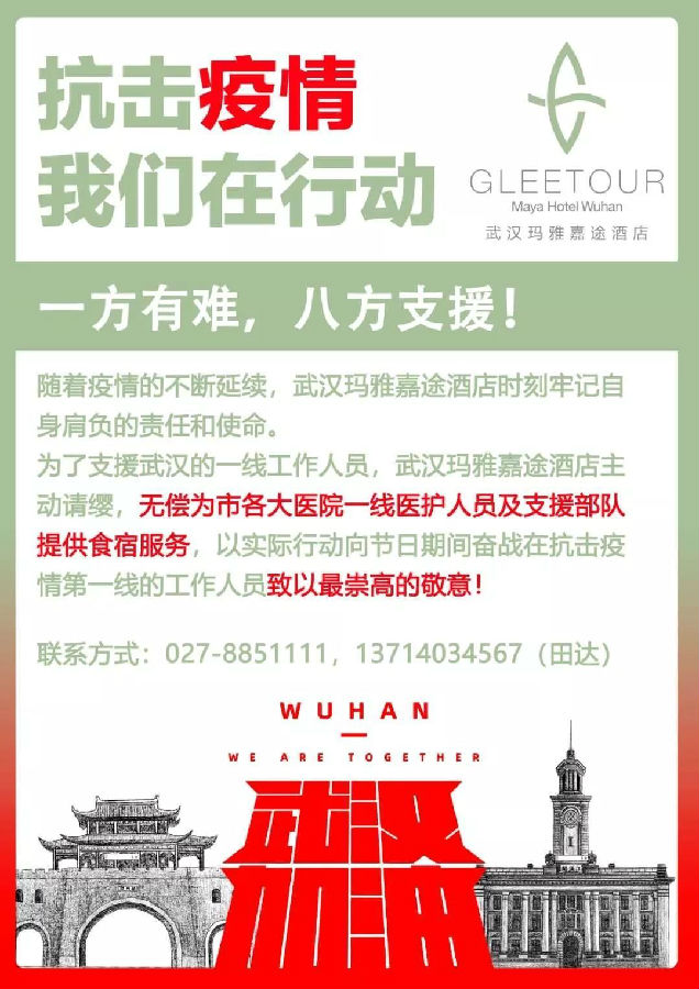 此外,华侨城武汉玛雅嘉途酒店还发起倡议,希望更多的武汉同行酒店能够积极加入支援行动,众志成城,为奋战在一线的最美“逆行者”们提供最温暖的帮助。